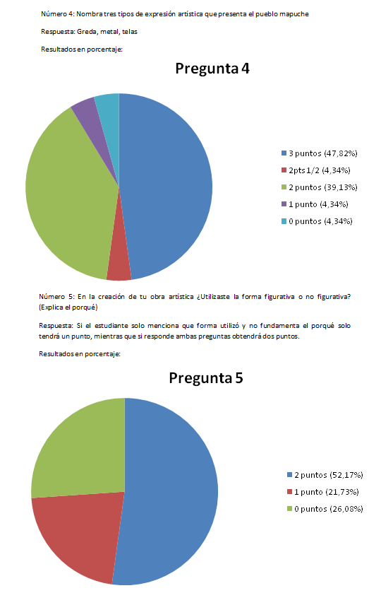 En el proyecto de aula "Descubriendo la cultura mapuche" esta evaluación sirvió para saber que técnicas de arte conocian los estudiantes, que convinaciónes de colores se pueden generar (en base a la luz y la sombra) y a traves de preguntas simples ver que tipo de lenguaje escrito desarrolla el estudiante, si es capaz de responder a lo que se le pregunta en estricto rigor, si es capaz de fundamentar y describir.